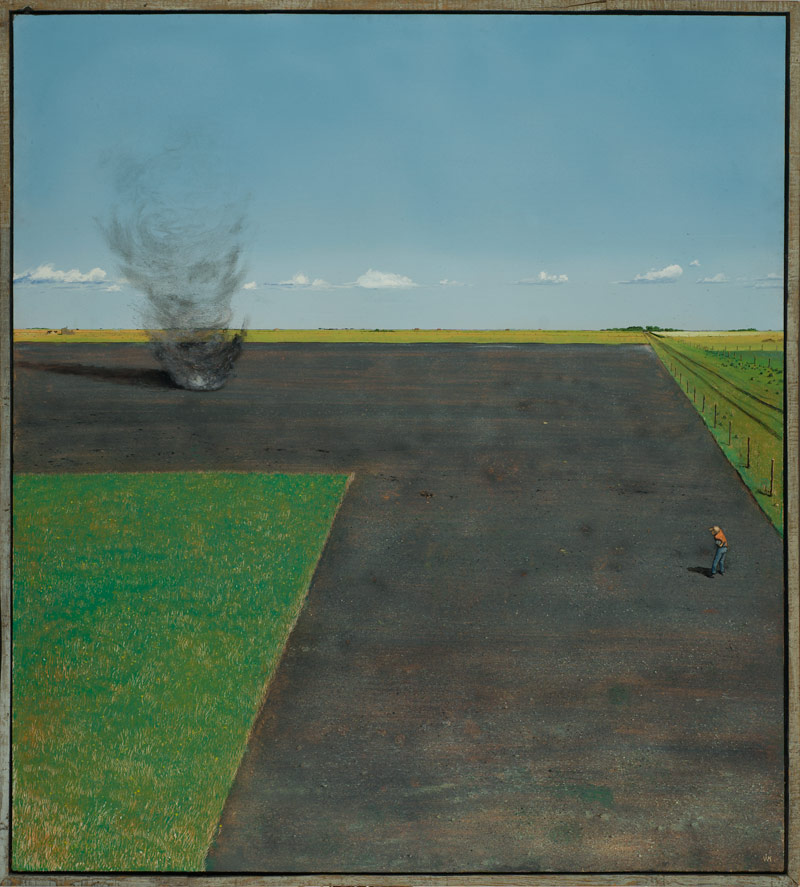 This work is a good example of how Kurelek’s landscapes are often distilled to a fundamental interplay of line, colour, and form—an aesthetic proposition. In both his photographs and paintings, he revisits specific land configurations for their inherent pictorial and formal interest. Certainly the cultivated land, or land being cultivated, provided the artist with raw visual material that was inherently abstract and reductive. The diagonal cut of land, fence line, or windbreak establishes rectangular formations that are repeatedly offset by the distant and persistent line of the horizon. Kurelek’s farmers are thus set down on abstracted ground, the earthly tethered to the otherworldly. The juxtaposition is ethereal, lyrical, and poetic.