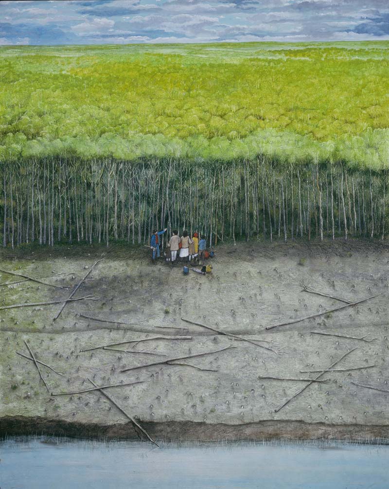 Note comment l'artiste a disposé ce groupe de personnes tout au milieu d'une vaste étendue qui semble sans limites. Pourquoi a-t-il fait cela selon toi? Comment se sentent-ils penses-tu?